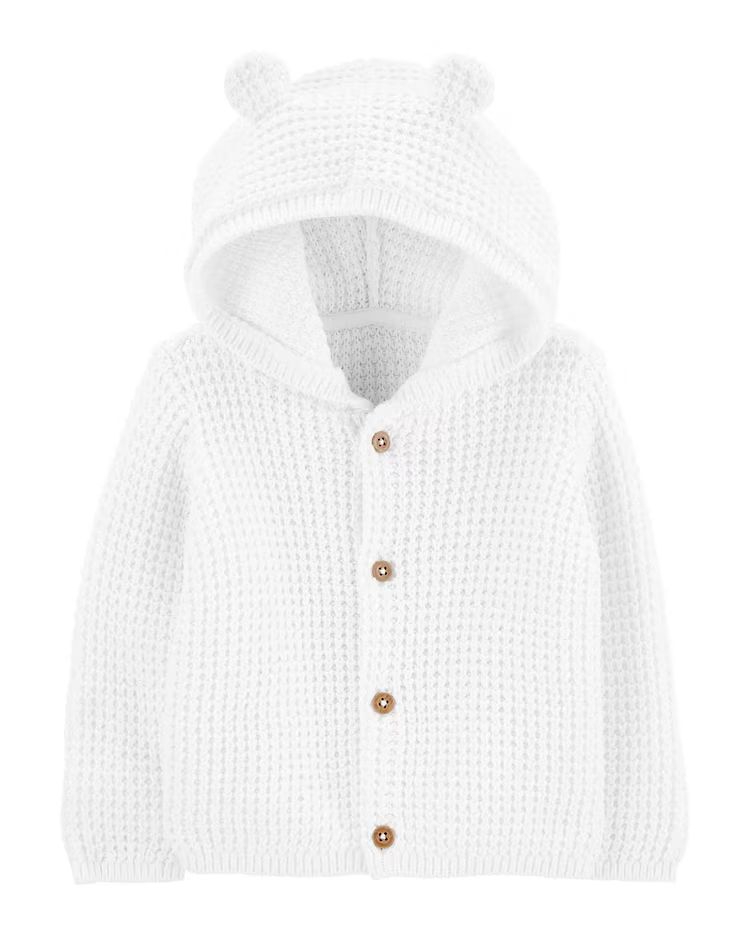 O Casaco Bebê Tricô Orelhinhas Branco Carter's Tam RN a 12 Meses é ideal para seu bebê, que ficará protegido do frio e super estiloso, o capuz com orelhinhas é o toque de fofura.